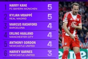 体育资讯10月23日讯 本赛季欧冠联赛阶段已战罢3轮,Squawka统计了到目前为止欧冠进球榜,拜仁前锋凯恩和皇马攻击手姆巴佩都打进5球,分列前二位。